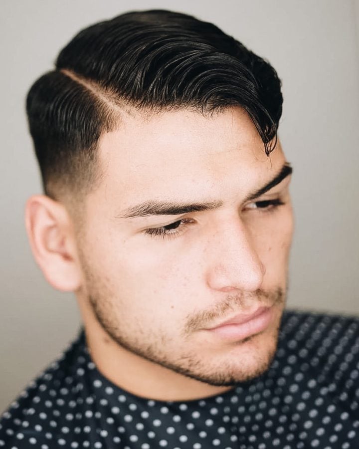 For a neat finish, this slightly longer-length variation of the comb over fade uses high-shine products to achieve a groomed, polished look. It’s a great option for anyone looking to keep things clean and tidy, and works best with straight hair.