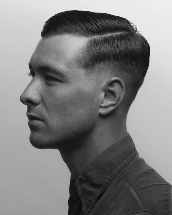 For a slightly harsher look, this variation accentuates the side parting by having it cut in. It’s much like the classic comb over fade, but the gap where the hair is parted is defined using unguarded clippers to shave the line in.