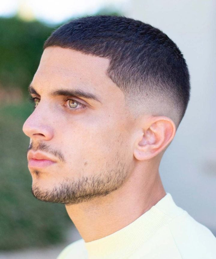 This closely clippered version keeps everything as neat and tidy as possible. The hair is buzzed short on top and even shorter at the back and sides, with that all-important fade. Because the hair is so short on top, a skin fade is often used at the back and sides. This allows the barber to maintain that faded look which comes from a graduation in length while keeping the hair extremely short.