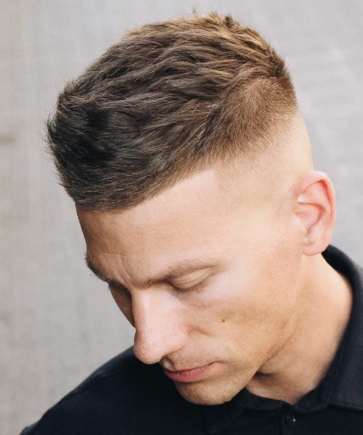 This is the high and tight in its purest, simplest form. It’s buzzed down to the skin on the back and sides of the head and left very slightly longer on top. This variation is so short that it requires little to no styling and makes an excellent option for anyone who likes the low maintenance of a buzz cut but wants some degree of variation in length.