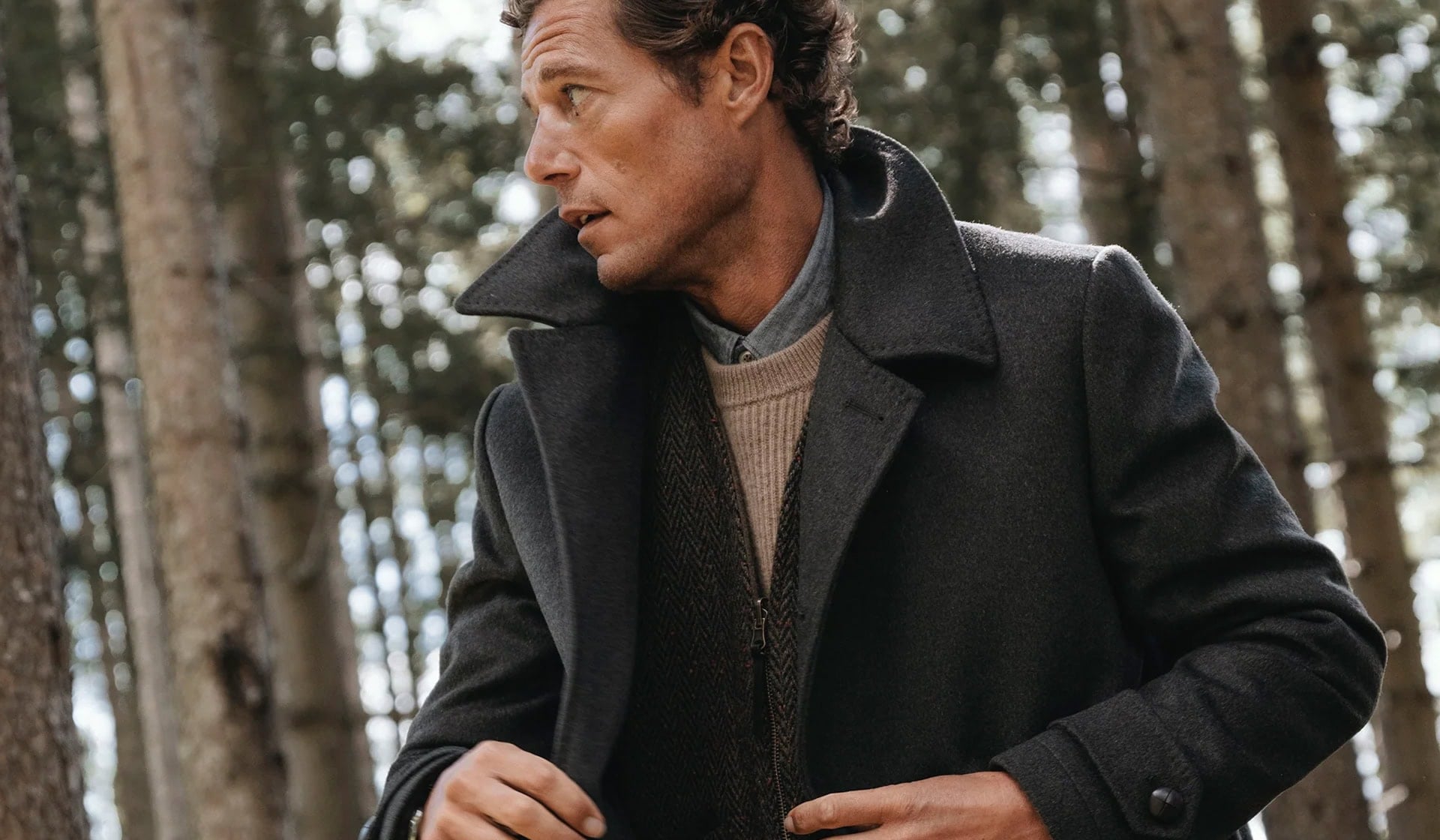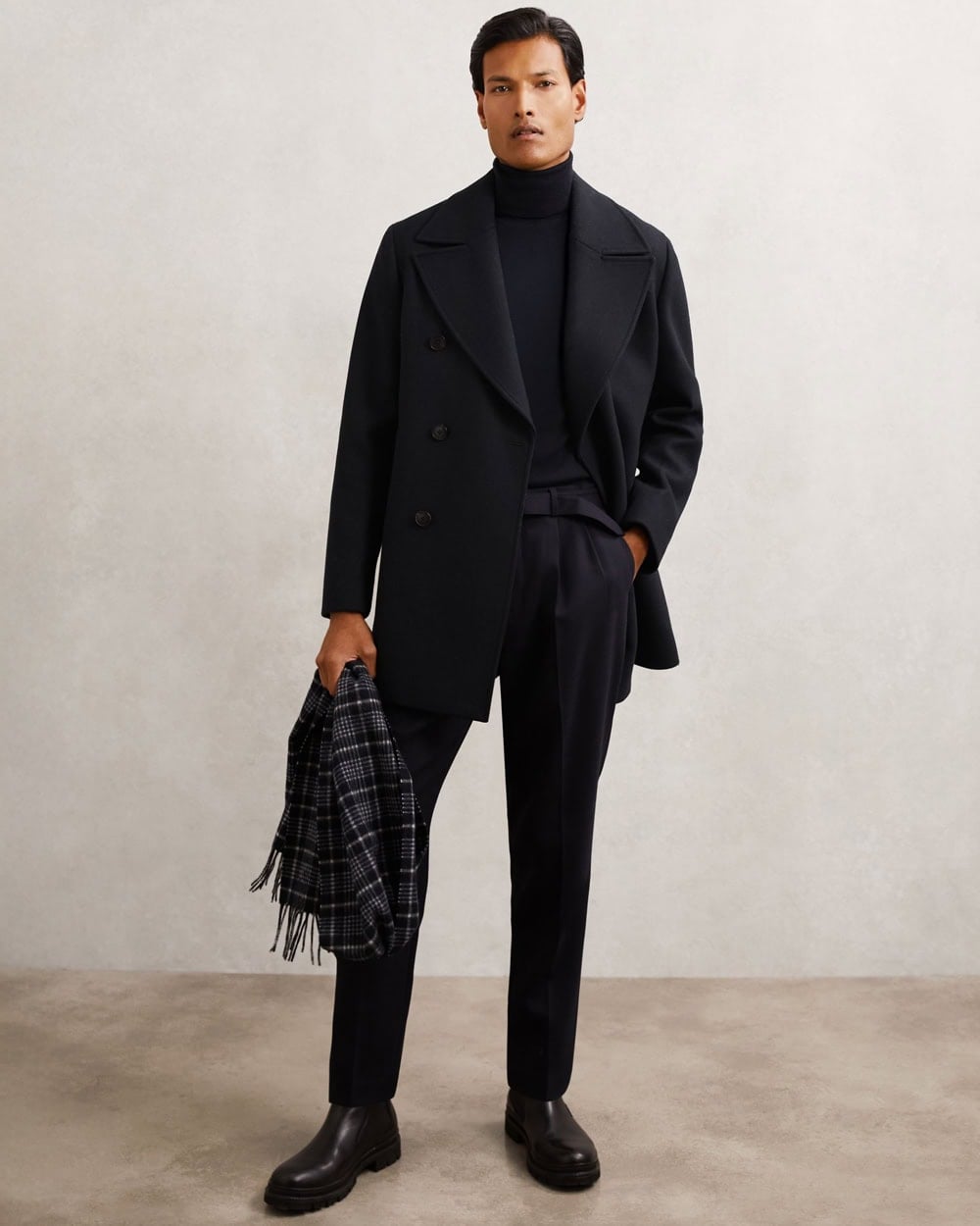 A classic peacoat will be cropped in length, feature broad lapels reaching almost across the shoulder, be double-breasted at the front, fastened by large buttons, and to the sides house vertical or diagonal-slash pockets. You may even find some iterations with epaulettes, but this is perhaps a step too far.
