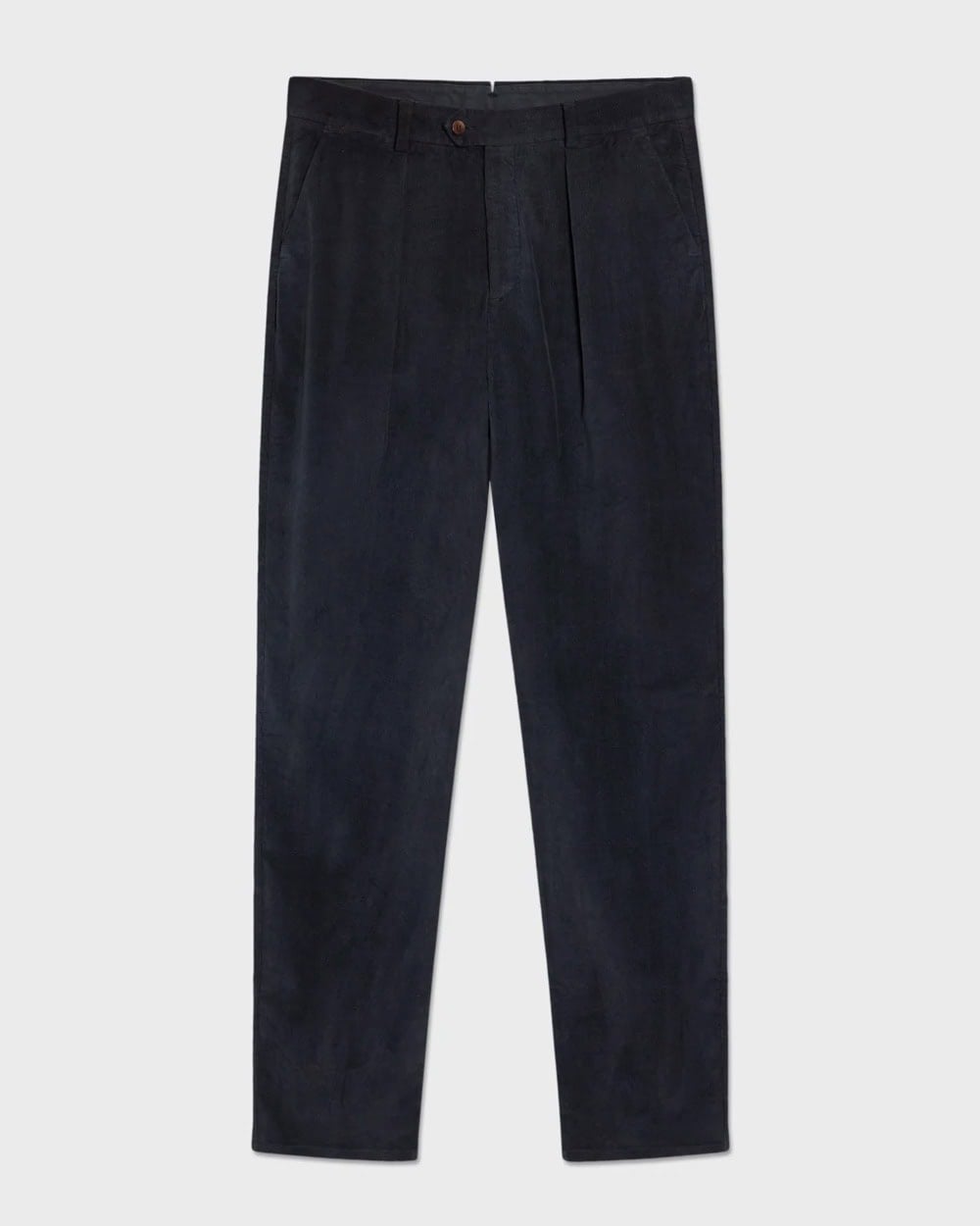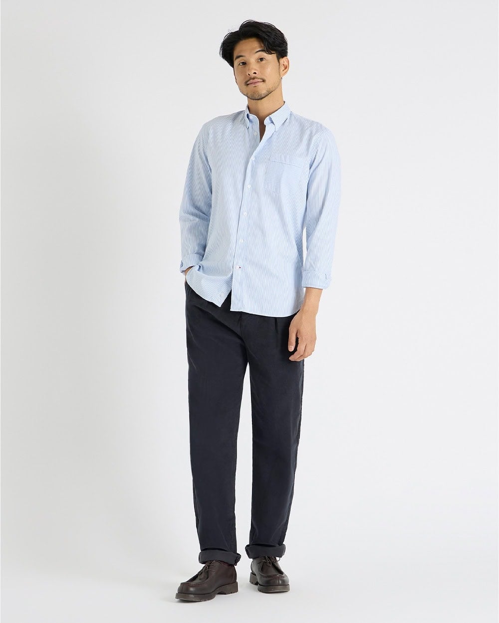 This look shows how cords can step up into smarter territory while still feeling completely relaxed. A pale blue Oxford shirt instantly adds polish, while the dark navy trousers dial up the sophistication — a pairing that feels clean, modern and quietly confident.