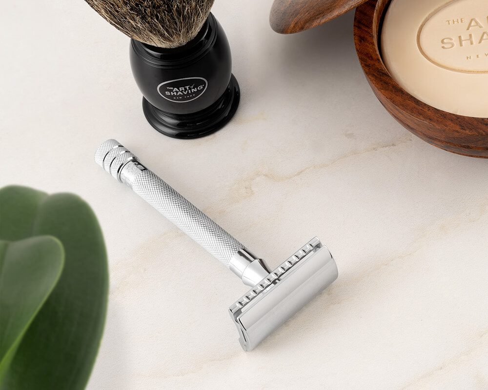 That’s why you’re much better off leaving the straight razors to the pros and opting instead for what is known as a safety razor. They come in two key forms: traditional, double-edged safety razors and modern, reusable safety razors. What unites them both is the fact that they have some sort of guard between the edge of the blade and the skin.