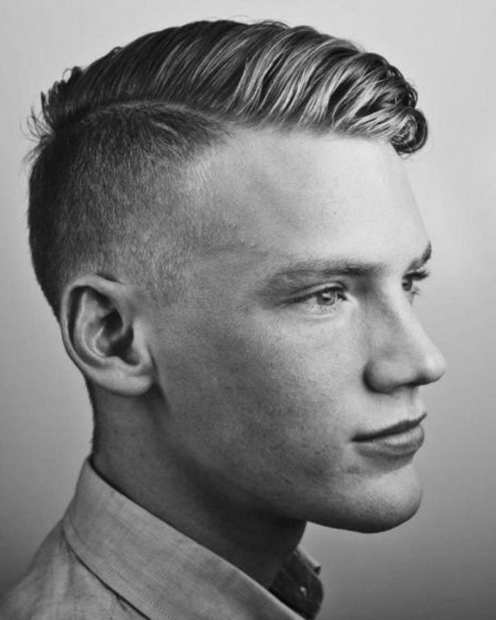 For a slightly harsher look, this variation accentuates the side parting by having it cut in. It’s much like the classic comb over fade, but the gap where the hair is parted is defined using unguarded clippers to shave the line in.