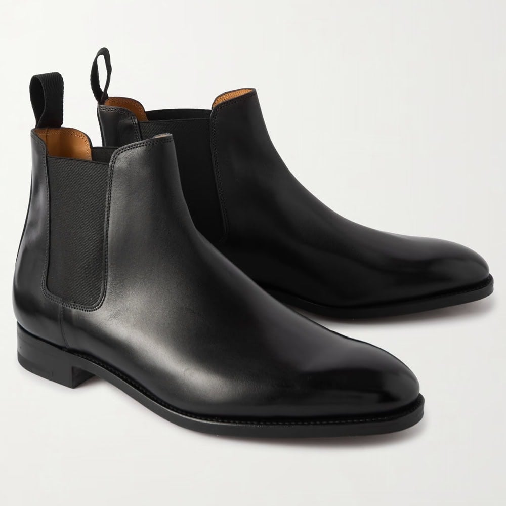 John Lobb’s ‘Lawry’ Chelsea boot in black leather is a masterclass in enduring craft: 190 meticulous steps, Goodyear-welted construction, vegetable-tanned soles with rubber tips for grip. Timeless polish from the Northamptonshire legends, built to be resoled and cherished for decades.