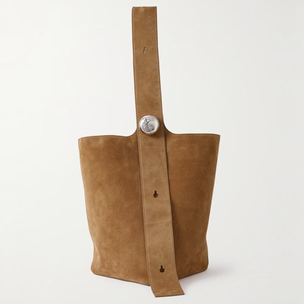 Loewe’s supple suede bucket bag combines practicality with signature style: adjustable thick strap, movable ‘Anagram’-stamped pebble, and full-grain leather lining for durability. Spacious enough for daily essentials or bulkier items, it’s a wholesale upgrade for the everyday tote.