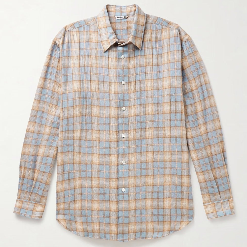 Auralee’s ‘Airy’ wool-flannel shirt lives up to its name with a soft handle and crinkled finish that adds lived-in character. The checked pattern keeps things interesting without shouting, delivering a sophisticated layer that pairs well with relaxed tailoring or casual looks alike.