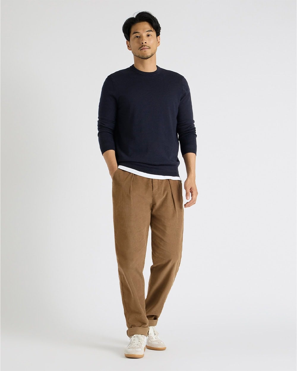 This look shows how cords can step up into smarter territory while still feeling completely relaxed. A pale blue Oxford shirt instantly adds polish, while the dark navy trousers dial up the sophistication — a pairing that feels clean, modern and quietly confident.