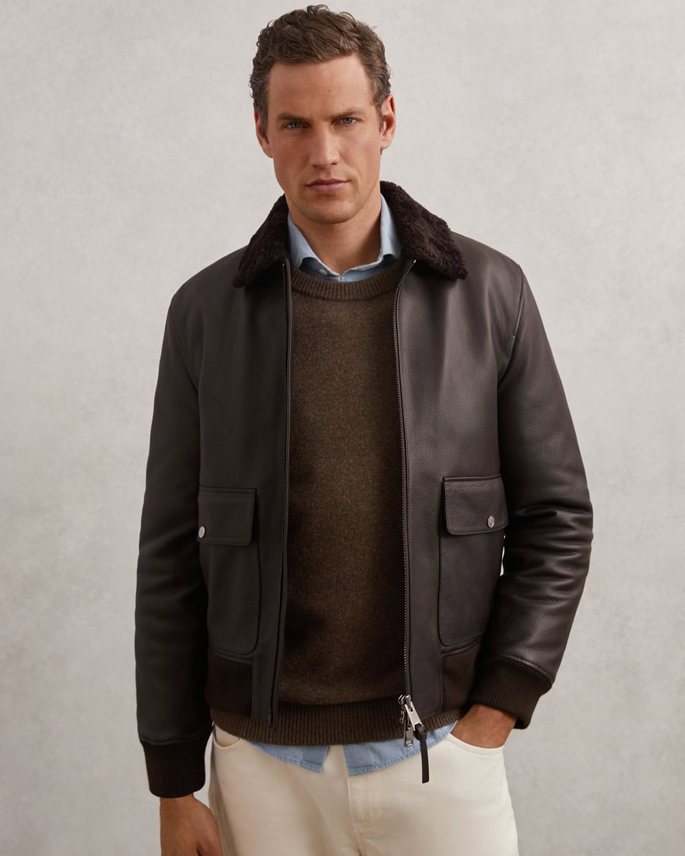 - Reiss Hardy Shearling-Collar Leather Jacket