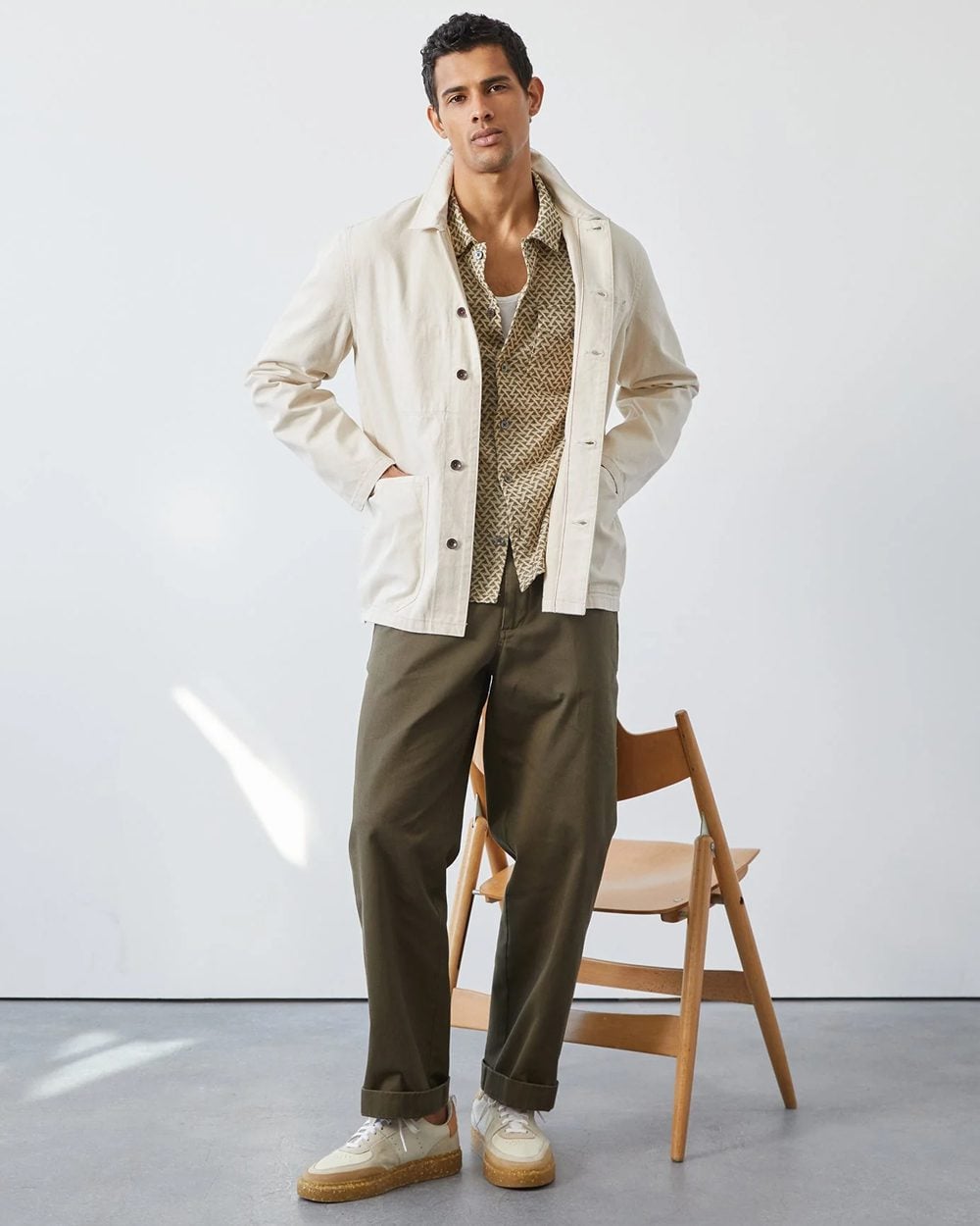 The natural instinct is to wear a chore coat with other workwear staples like denim or carpenter pants, but it’s also fun to cross the streams and pair one with smarter trousers. Either way, it’s a modern must-have.